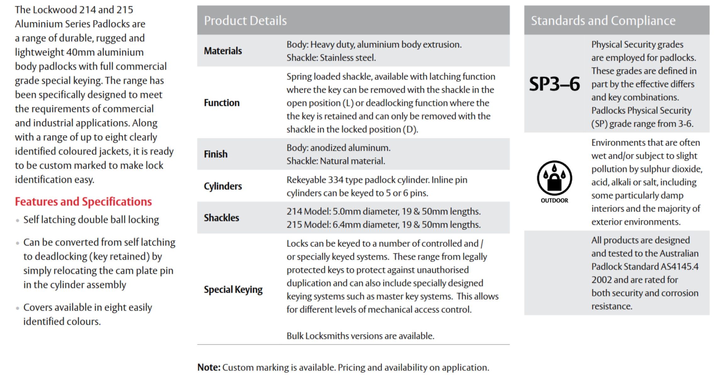 Lockwood 214 & 215 Series Aluminium Body Safety Padlocks — Item Code Family