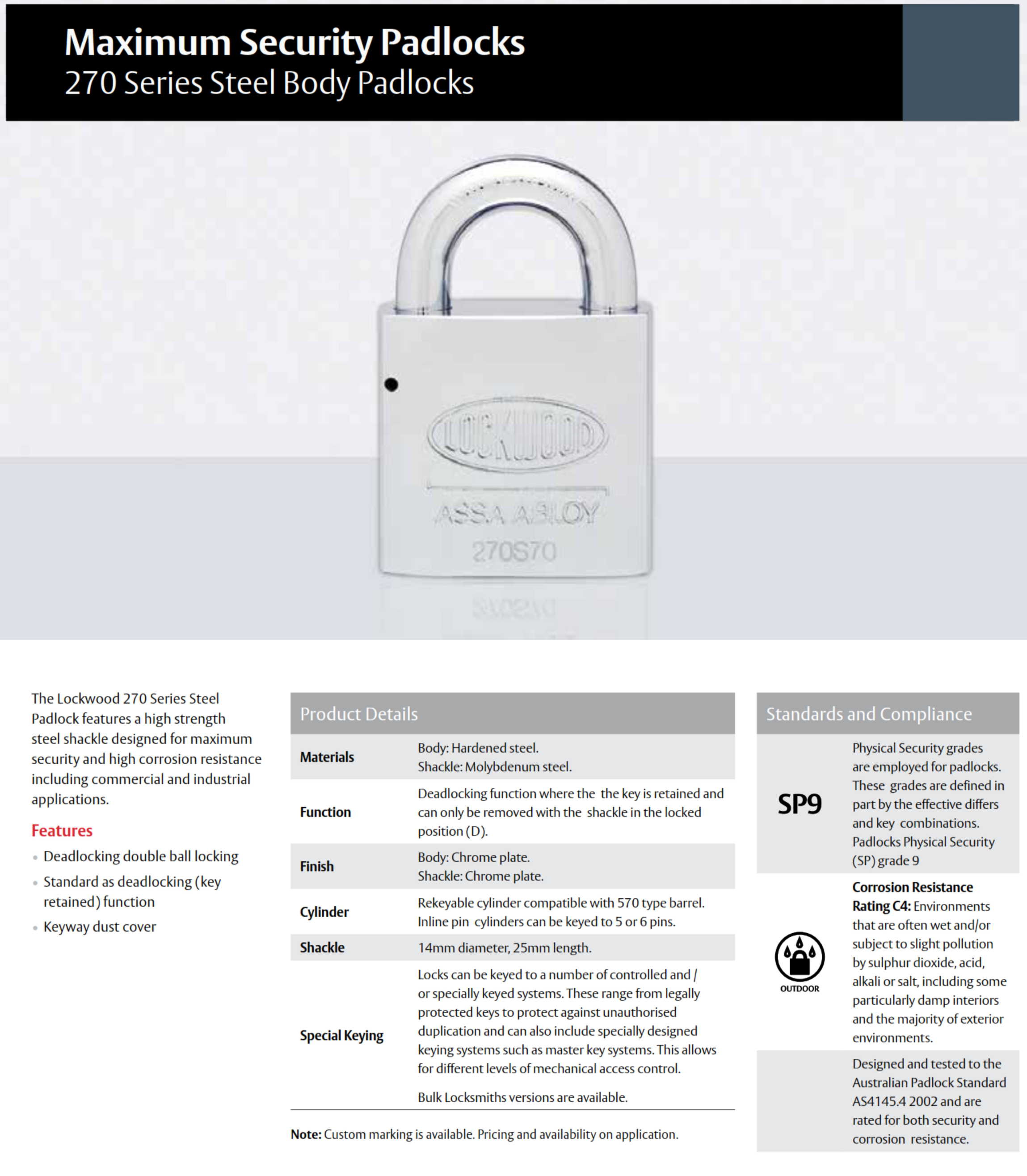 - Compliance: Tested to Australian Padlock Standard AS4145.4:2002.