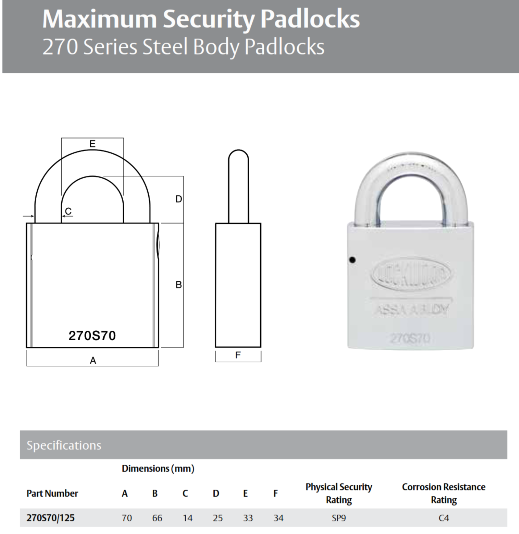 The Lockwood 270S70/125 padlock is a 70 mm steel body high-security padlock designed for maximum protection in commercial and industrial applications. Featuring a 14 mm diameter molybdenum steel shackle with 25 mm clearance, a hardened steel case, and a rekeyable cylinder, this model is built to withstand extreme attack and harsh environments.