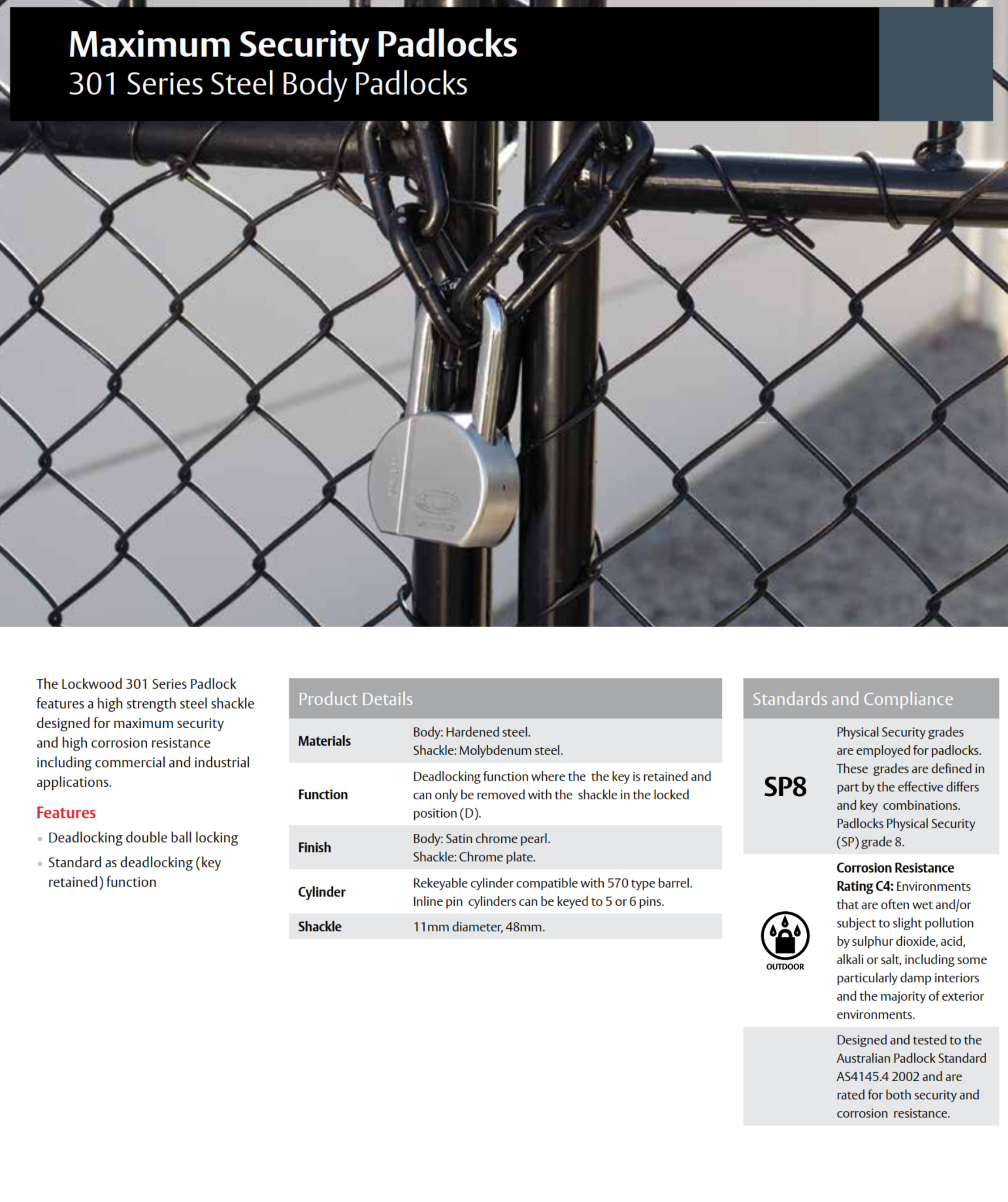 - Compliance: Designed and tested to Australian Padlock Standard AS4145.4:2002.