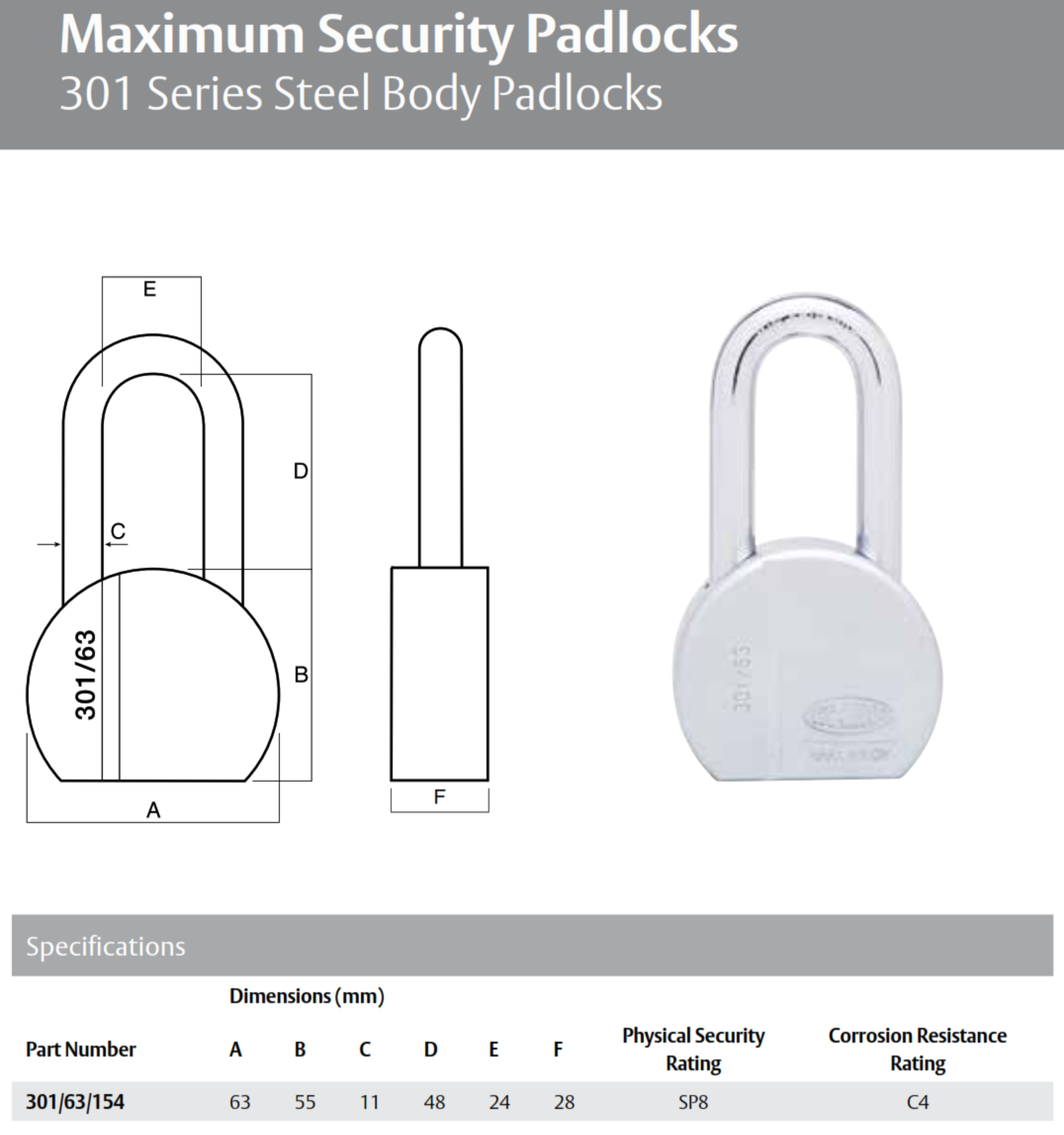 The Lockwood 301/63/154 is a 63 mm hardened steel body padlock built for maximum security in commercial and industrial settings. It pairs a tough 11 mm chrome molybdenum steel shackle with deadlocking double ball locking and a rekeyable cylinder for controlled access.