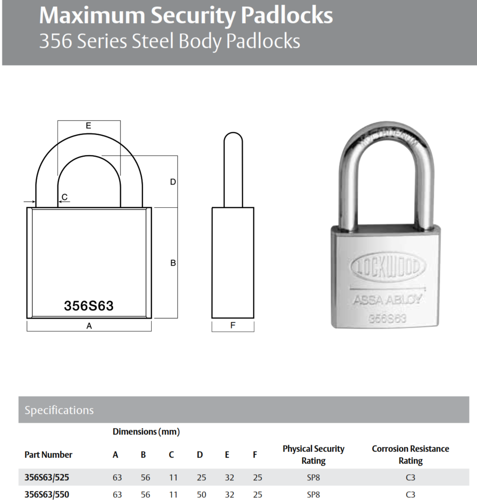 The Lockwood 356S63/525 padlock is part of the 356 Series, designed for maximum security and high corrosion resistance. With a 63 mm hardened steel body and a 11 mm molybdenum steel shackle (25 mm clearance), it is suited to commercial and industrial applications where durability and resistance to attack are critical. This model is supplied in a Display Pack (NDP).