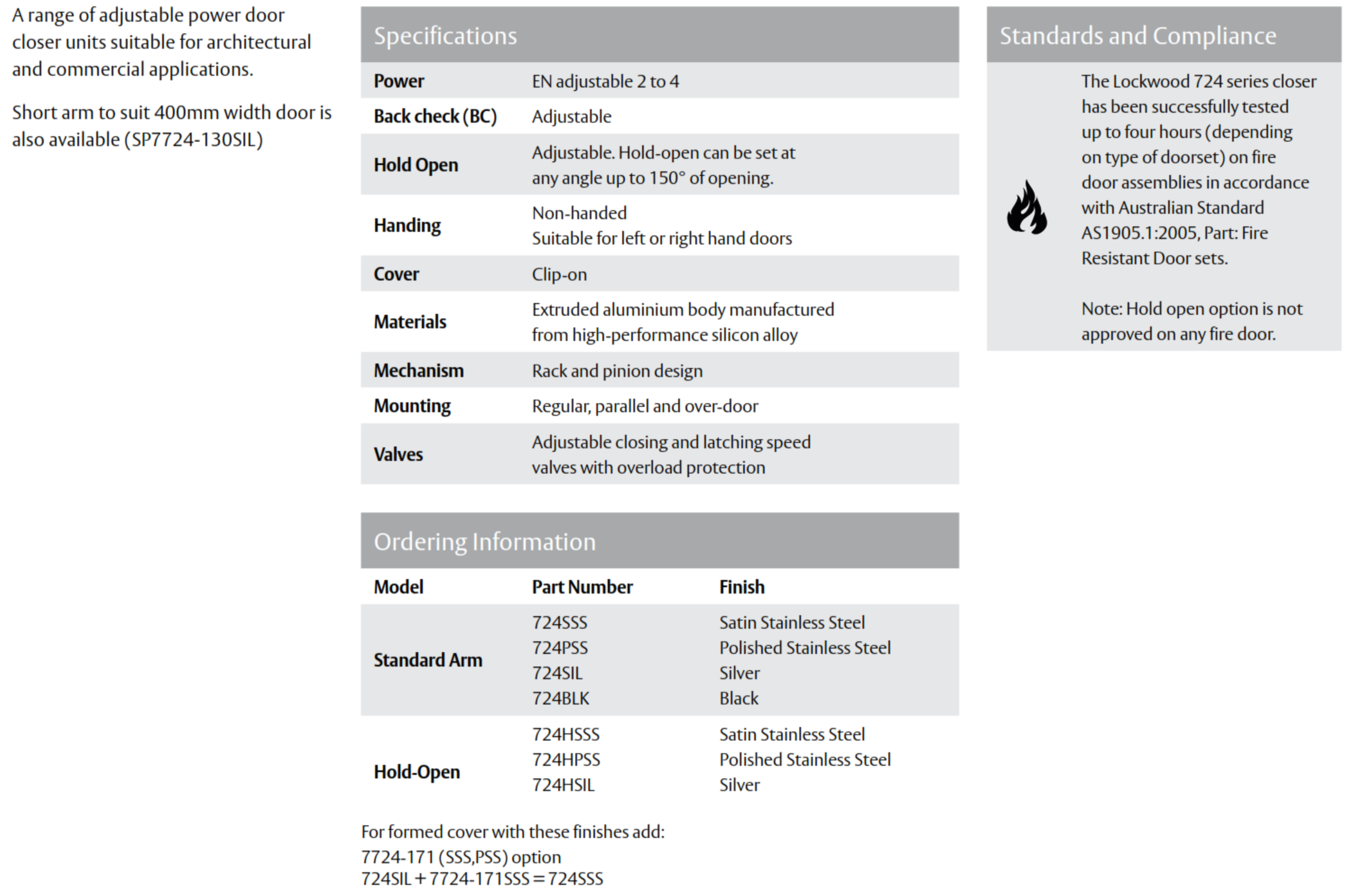 The Lockwood 724 Series is a rack and pinion economy door closer designed for architectural and commercial applications. It provides reliable performance with EN2–4 adjustable power, adjustable backcheck, and multi-position mounting. Suitable for doors up to 1100 mm wide and tested for use on fire door assemblies for up to 4 hours.