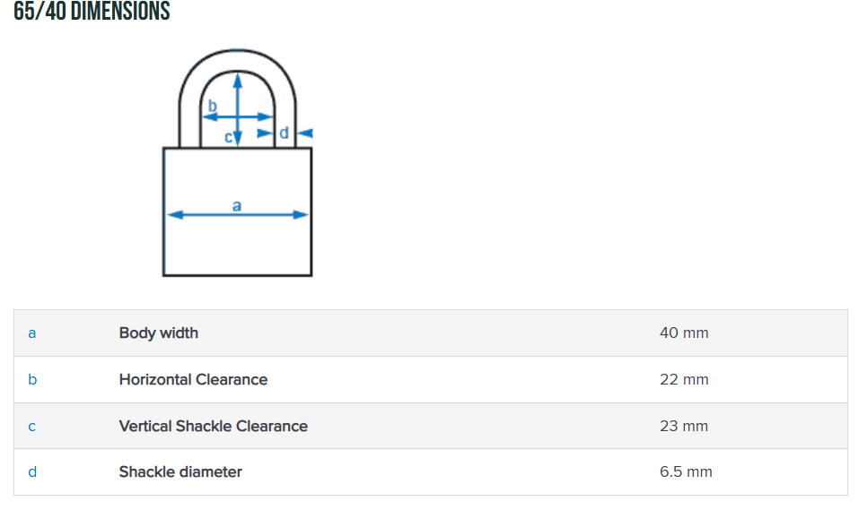 - ABUS 65/40 solid brass padlock (keyed to differ)