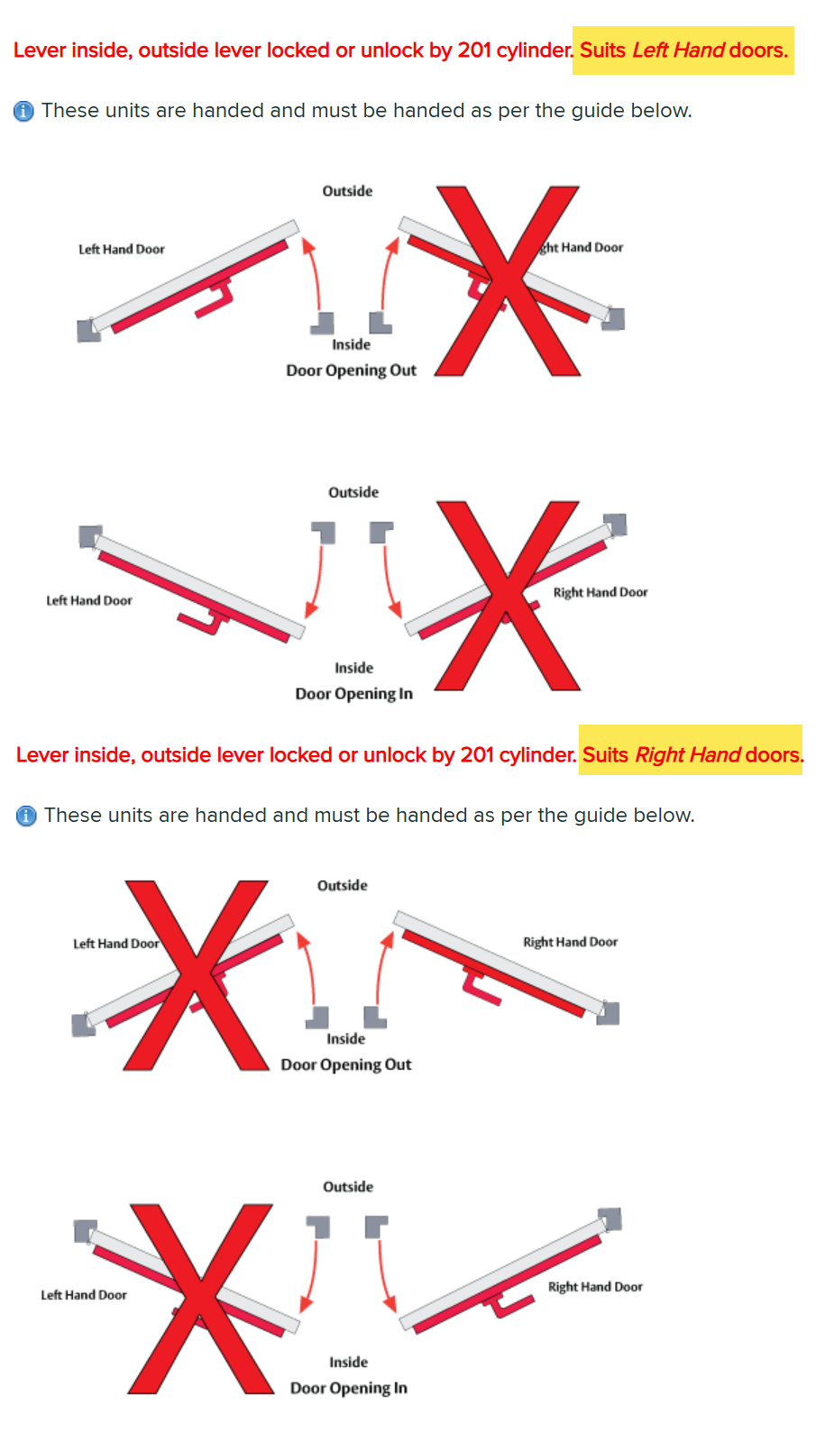 This locking bar is factory handed. Left hand and right hand models are different products and must be selected correctly based on door handing. Incorrect handing will prevent installation.