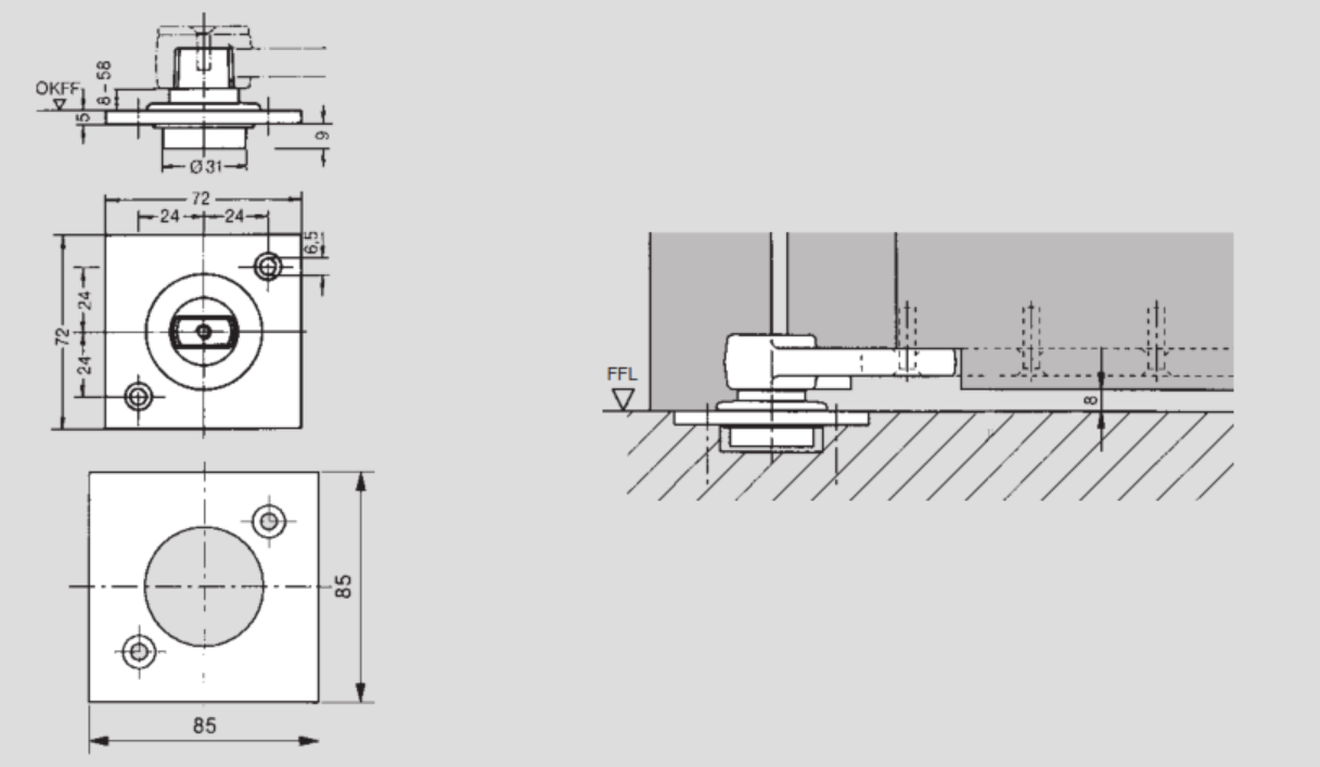 - Floor-mounted pivot bearing for Dorma BTS floor spring systems.