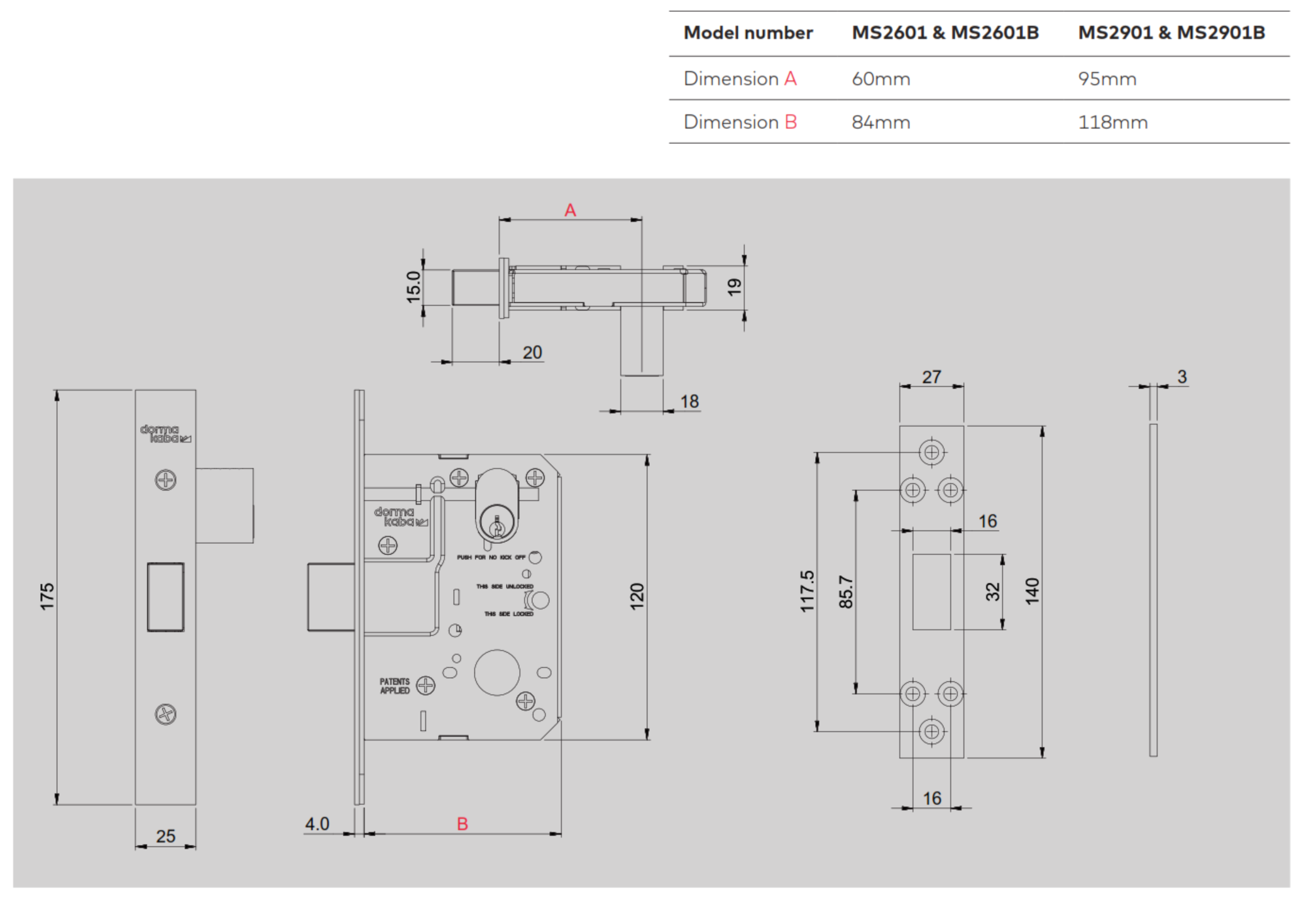 Dormakaba MS2600 series primary mortice deadbolt and mortice lock options designed for commercial applications where a robust stainless steel locking platform is required. This range includes both a dedicated deadbolt model and a function-adaptable primary mortice lock, sharing a common 60 mm backset and construction platform.
