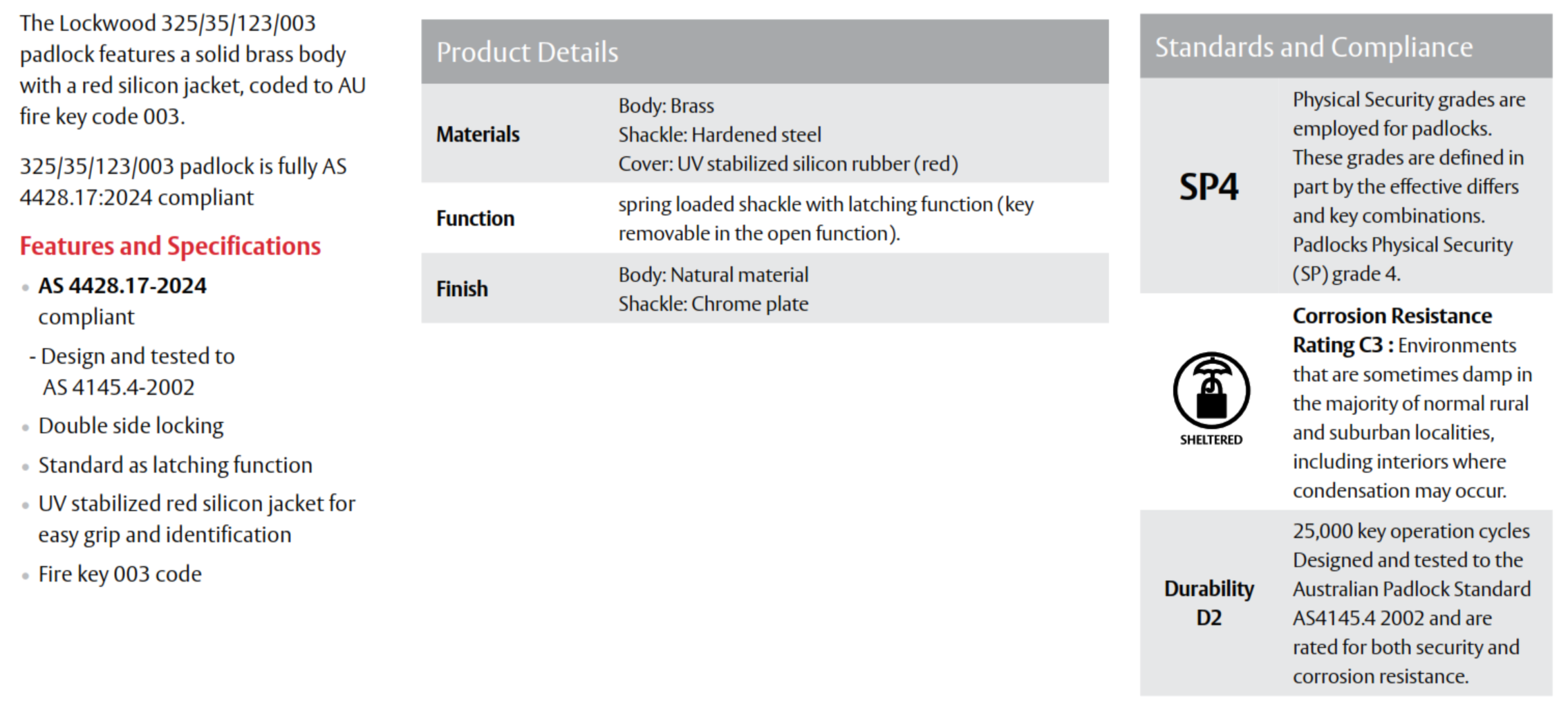 The Lockwood 325/35/123/003 is a 35 mm brass body fire safety padlock, designed specifically for compliance with fire panel and emergency access requirements. It features a red silicone protective cover for easy identification, and is supplied with the AU003 fire key in accordance with AS 4428.17:2024.