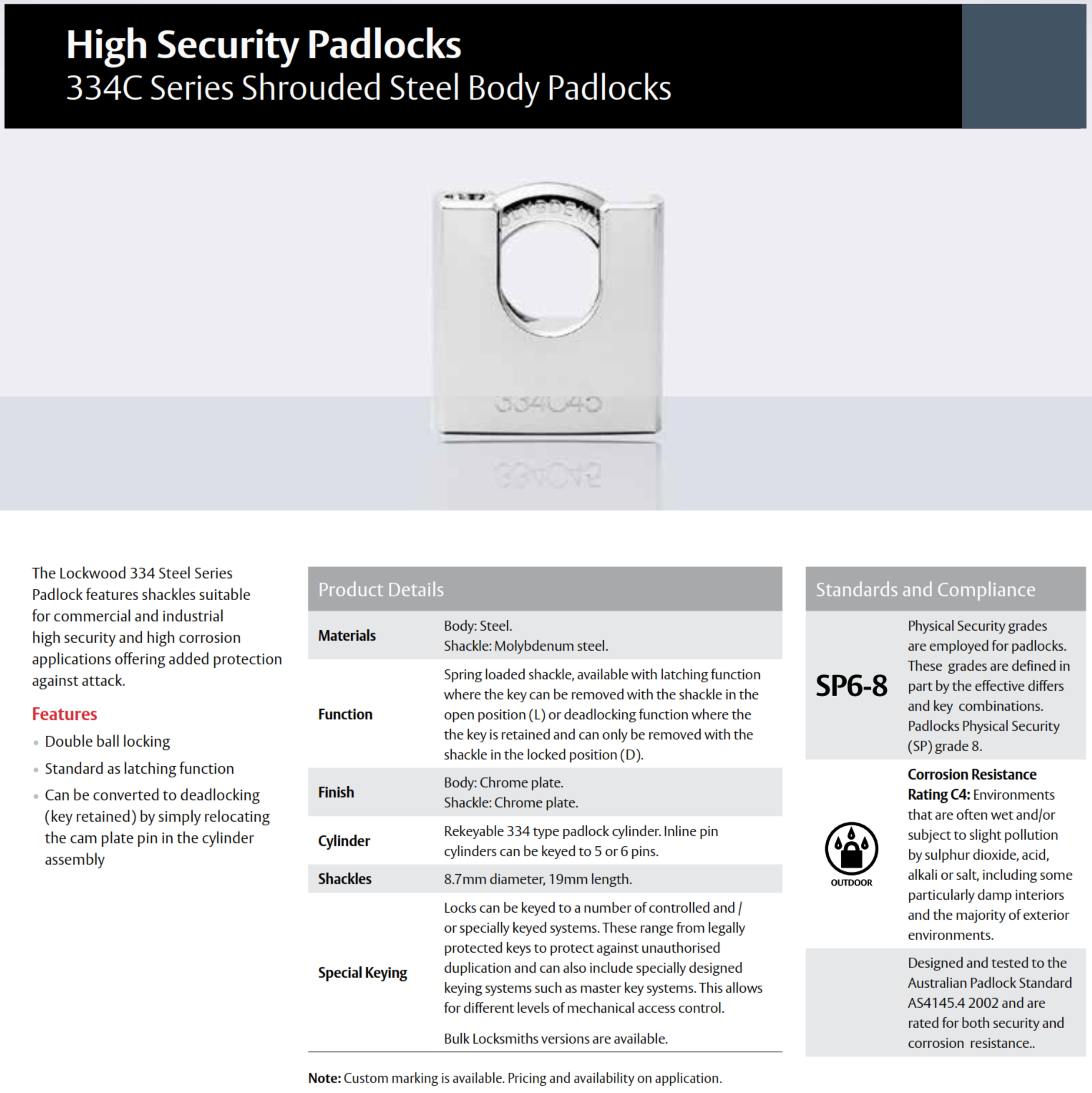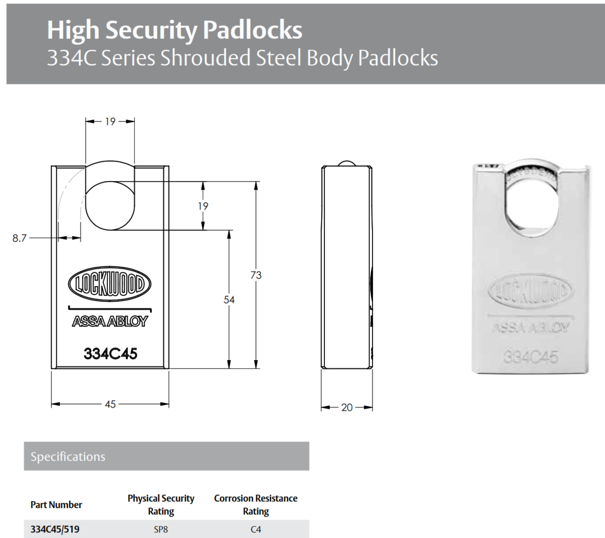 The Lockwood 334C45/519/NDP padlock is part of the 334C Shrouded Steel Body Series, engineered for commercial, industrial and institutional applications where resistance to cutting and prying attacks is critical. With a 45 mm hardened steel body and an 8.7 mm molybdenum steel shackle protected by a shroud, this model provides superior physical protection and corrosion resistance.