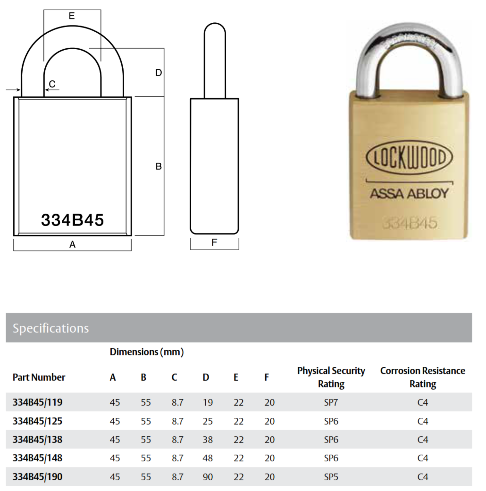 The Lockwood 334B45/125/BK padlock is part of the 334B High Security Brass Body Series, engineered for commercial and industrial applications where durability and corrosion resistance are essential. With a solid brass extrusion case and 8.7 mm boron steel shackle, this padlock delivers high performance security with the convenience of the Rapid Change Shackle system.
