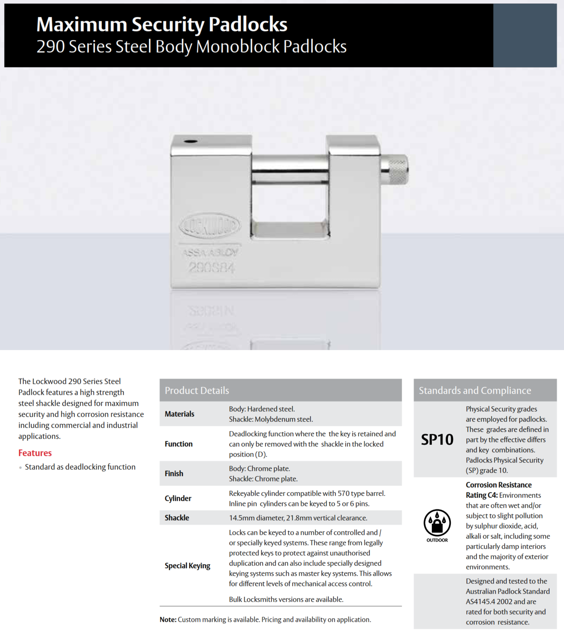 The Lockwood 290S84/120 padlock is part of the Maximum Security Monoblock Series, designed for high-risk commercial and industrial applications. With a heavy duty 96 mm hardened steel body and a 14.5 mm molybdenum steel shackle, this padlock achieves the highest SP10 security grade and delivers superior corrosion resistance.